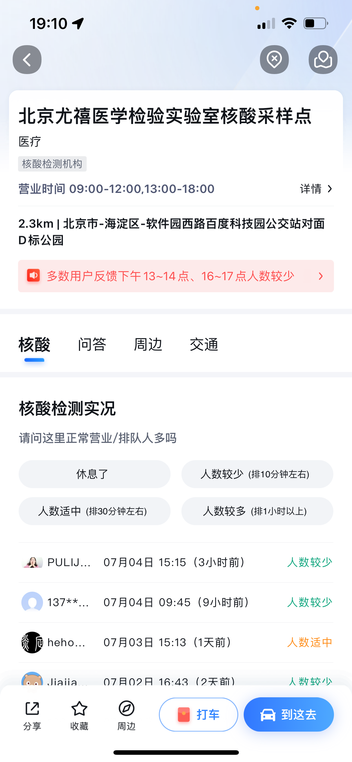 為持續鞏固疫情防控成果,百度地圖近日還針對全國350多個城市上線了“核酸實況”功能。用户可以在核酸採樣點詳情頁中,點擊“休息了”“人數較少”“人數適中”“人數較多”等標籤一鍵上報,便捷分享現場情況;同時百度地圖還將結合用户反饋,對核酸檢測點人數較少的時間段進行智能推薦,方便用户及時瞭解該採樣點的營業狀態及排隊情況,合理安排檢測時間,儘可能縮短等候時長,提升常態化核酸檢測效率。