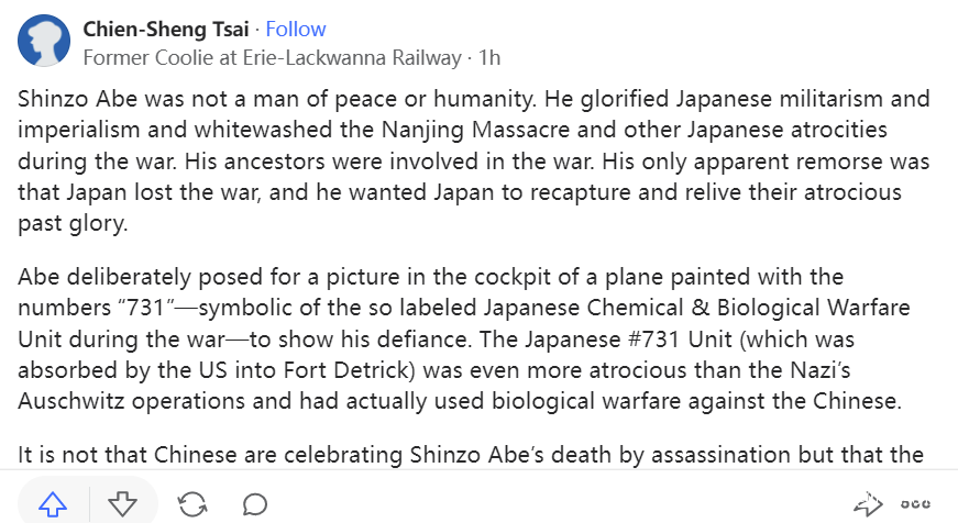 顯然,你是無知的,或者不知道他做過什麼。谷歌 “安倍晉三在731飛機上”。這應該足以解釋為什麼這麼多中國人對他的死亡感到高興。