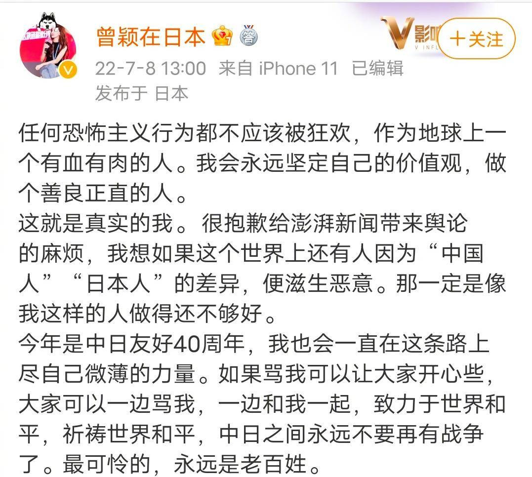 女記者曾穎在面對這麼一位前首相亡故如此大灑“忘情水”,究竟是什麼原因觸動了她的一腔柔情?她忘了自己雙肩擔道義的責任了嗎?作為一個新聞工作者,更要明辨是非,纏清黑白,理順關係,分清恩怨,在國家與民族面前,私情什麼也不是,儘管你對安倍存有善念,儘管你對日本存有好感,但也不足以使你忘了日本侵華的罪惡,忘了中華民族那段被人欺辱的歷史,所謂忘記歷史就意味着背叛,警言猶在,更何況還是一個軍國主義的亡魂。