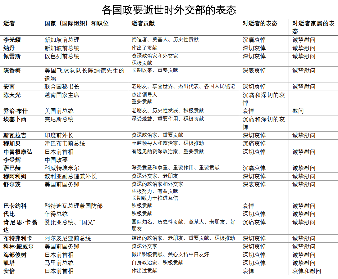 對比各國政要逝世時,外交部的悼念措辭_風聞