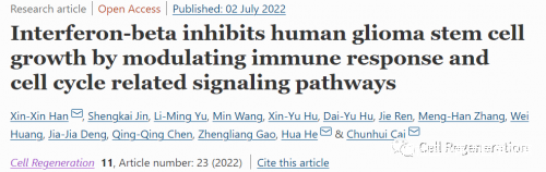 Han, XX., Jin, S., Yu, LM. et al. Interferon-beta inhibits human glioma stem cell growth by modulating immune response and cell cycle related signaling pathways. Cell Regen 11, 23 (2022). https://doi.org/10.1186/s13619-022-00123-w來源:Cell Regeneration