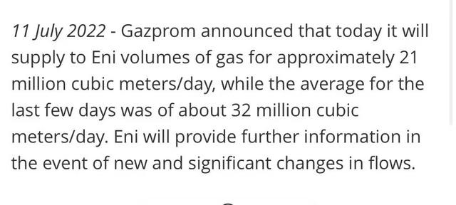 俄對意大利天然氣供應再減三成,法財長:俄輸歐天然氣可能完全停供當地時間11日,意大利能源公司埃尼集團發佈公告稱,已收到俄羅斯天然氣工業公司的通知,該公司當天將向意方供應2100萬立方天然氣,比之前日均供應3200萬立方減少三分之一。