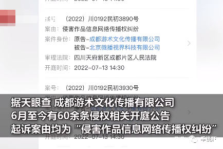 投訴方名叫**“成都遊術文化傳播有限公司”,網友查找相關背景注意到,這家公司提起了97場訴訟**——有告抖音的、有告B站的,有告騰訊視頻的,當然也有告譚喬個人的。