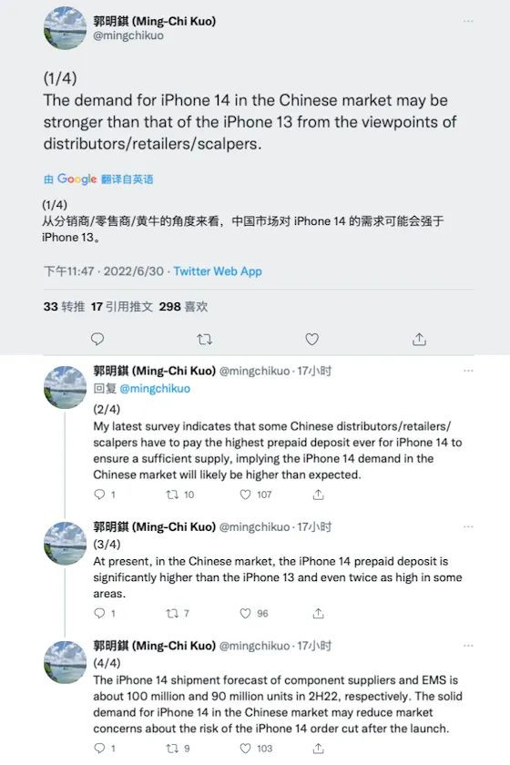 他指出,目前在中國市場上,蘋果 iPhone 14 的預付定金明顯高於 iPhone 13 系列,甚至在某些地區足足高出一倍。而根據零部件供應商和物流方面的人士分析預測,蘋果 iPhone 14 今年下半年的出貨量可能會達到約為 1 億部或 9000 萬部。