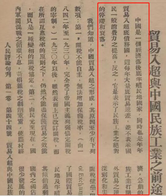 “中國是一個經濟落後的半殖民地國家,同時也是一個年年貿易入超的債務國,這每年大量的貿易逆差並不表示國民一般消費力之提高,反之,它是表示了民族工業之絕對的停滯和衰落。”