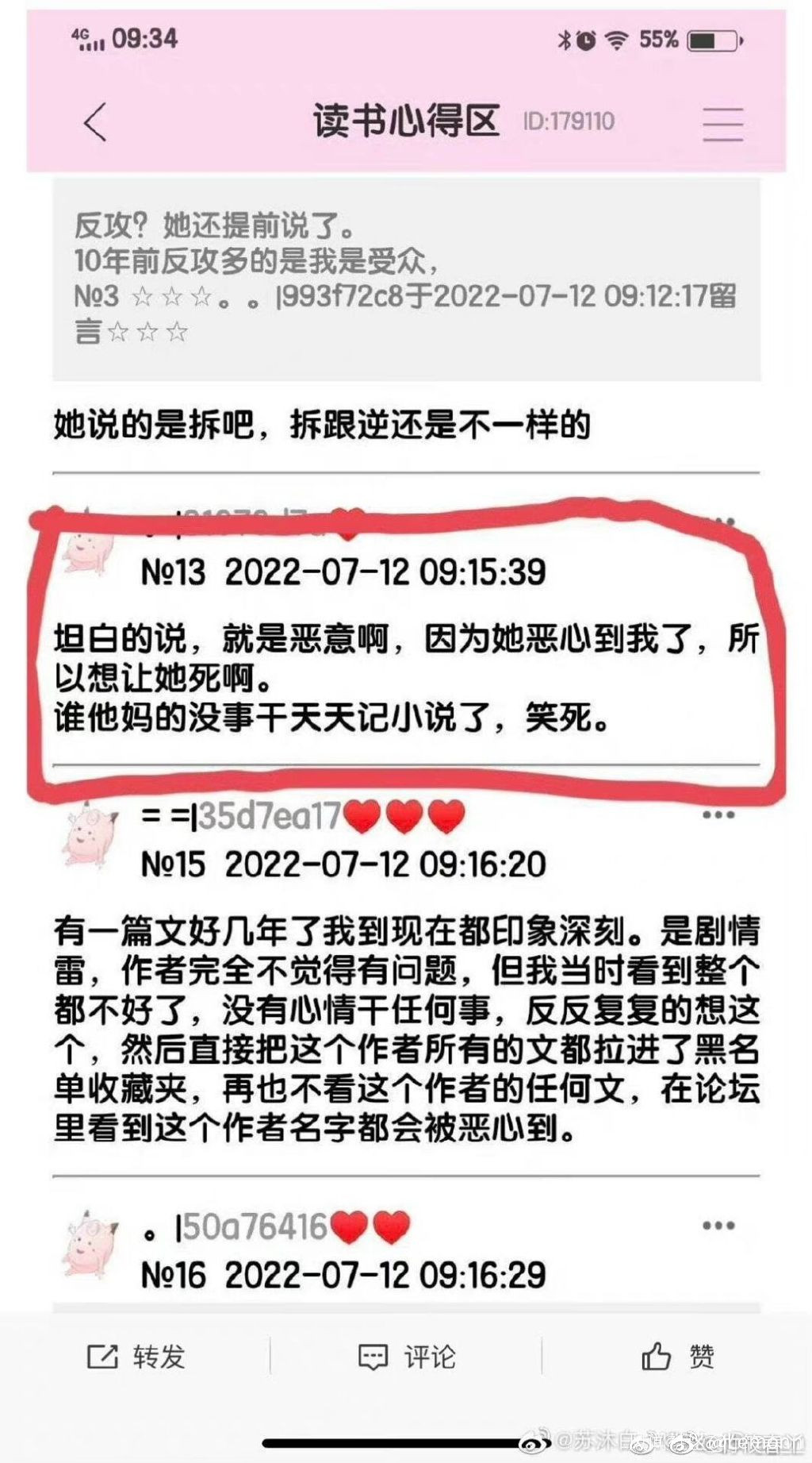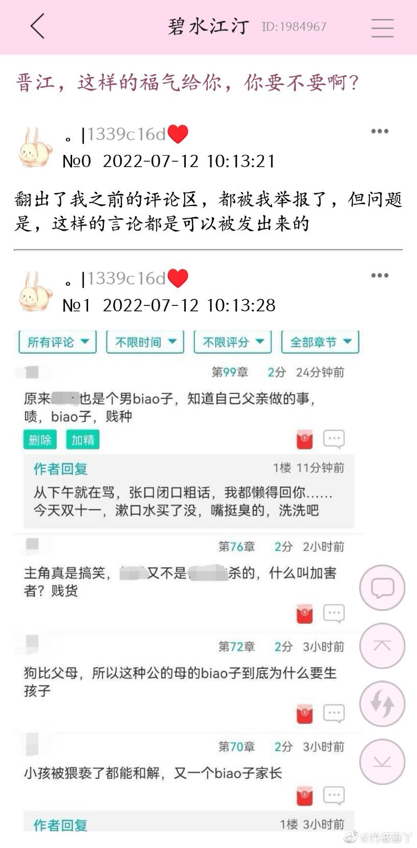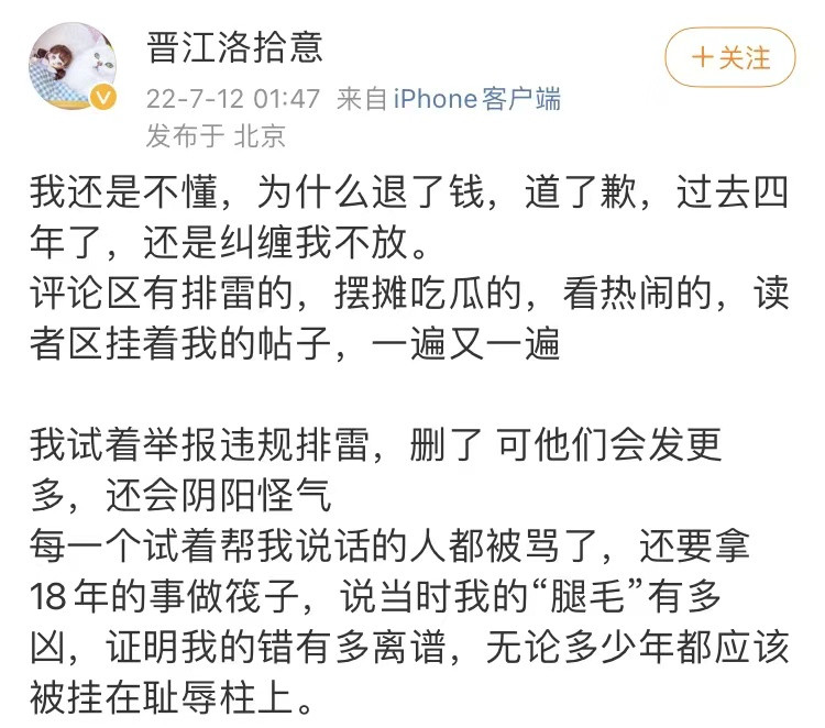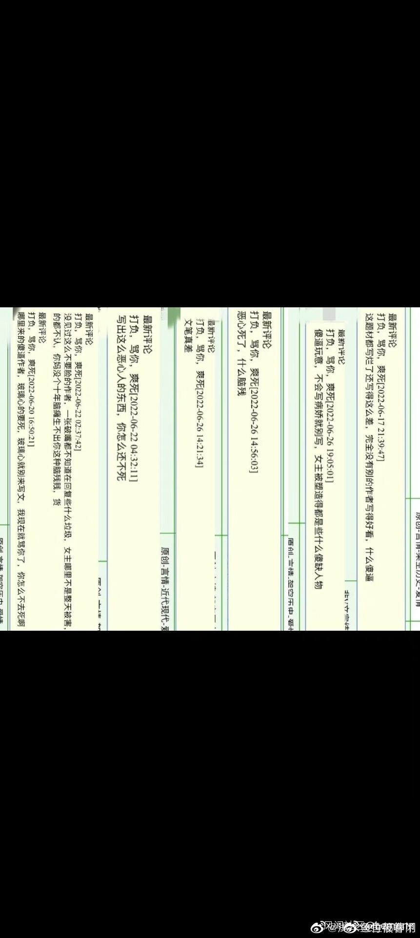 現在晉江平台上洛拾意作者所有作品底下的評論區都已經被關閉了,但是還是有其他網友把那些惡意的評論截圖放到了網上。