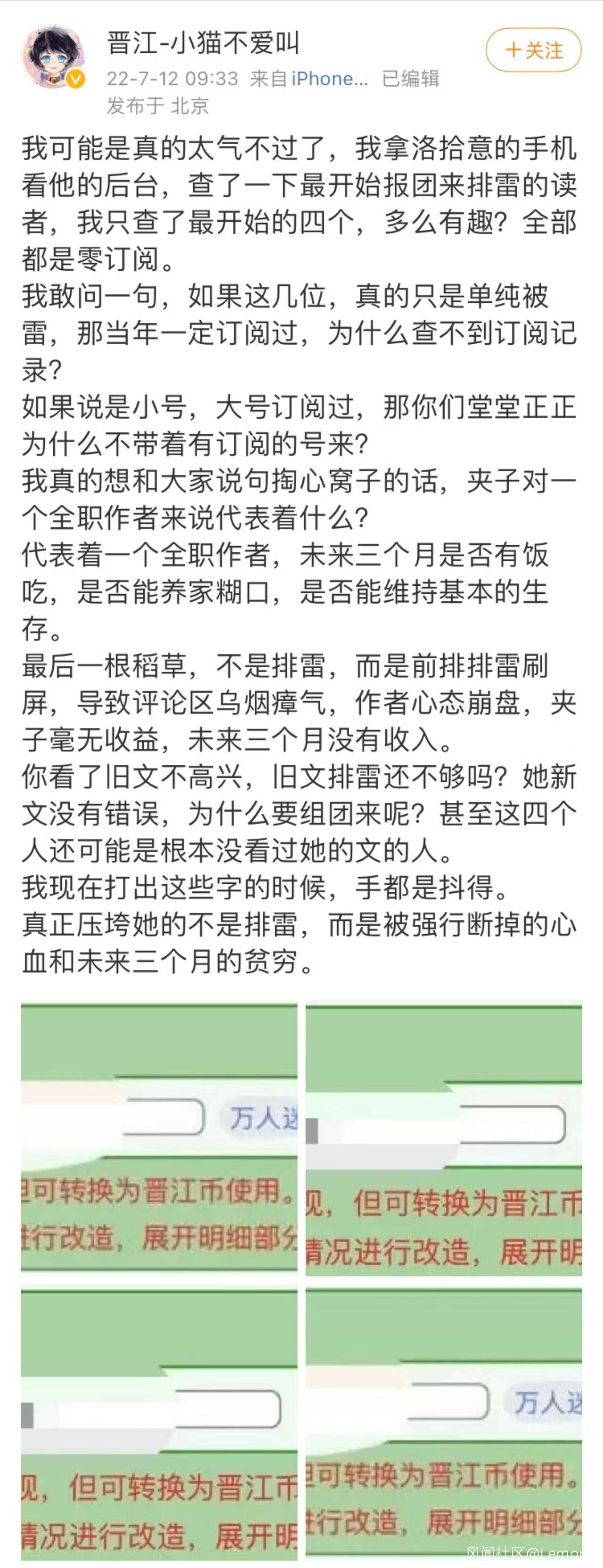 作者洛拾意的好友,也同樣是晉江網文作者的小貓不愛叫,查詢了寫作後台以後,發現這些瘋狂刷負排雷的大多是小號,而他們這些惡意的負評會導致作者本人三個月的貧窮。