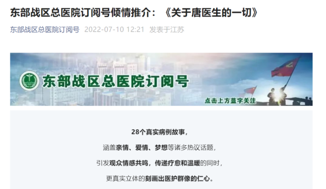 《關於唐醫生的一切》大結局上線前的中午,東部戰區總醫院微信公眾號撰文推薦了這部劇,一家醫療水平能排進全國前50的醫院,就這樣成為了這部劇的“自來水”。