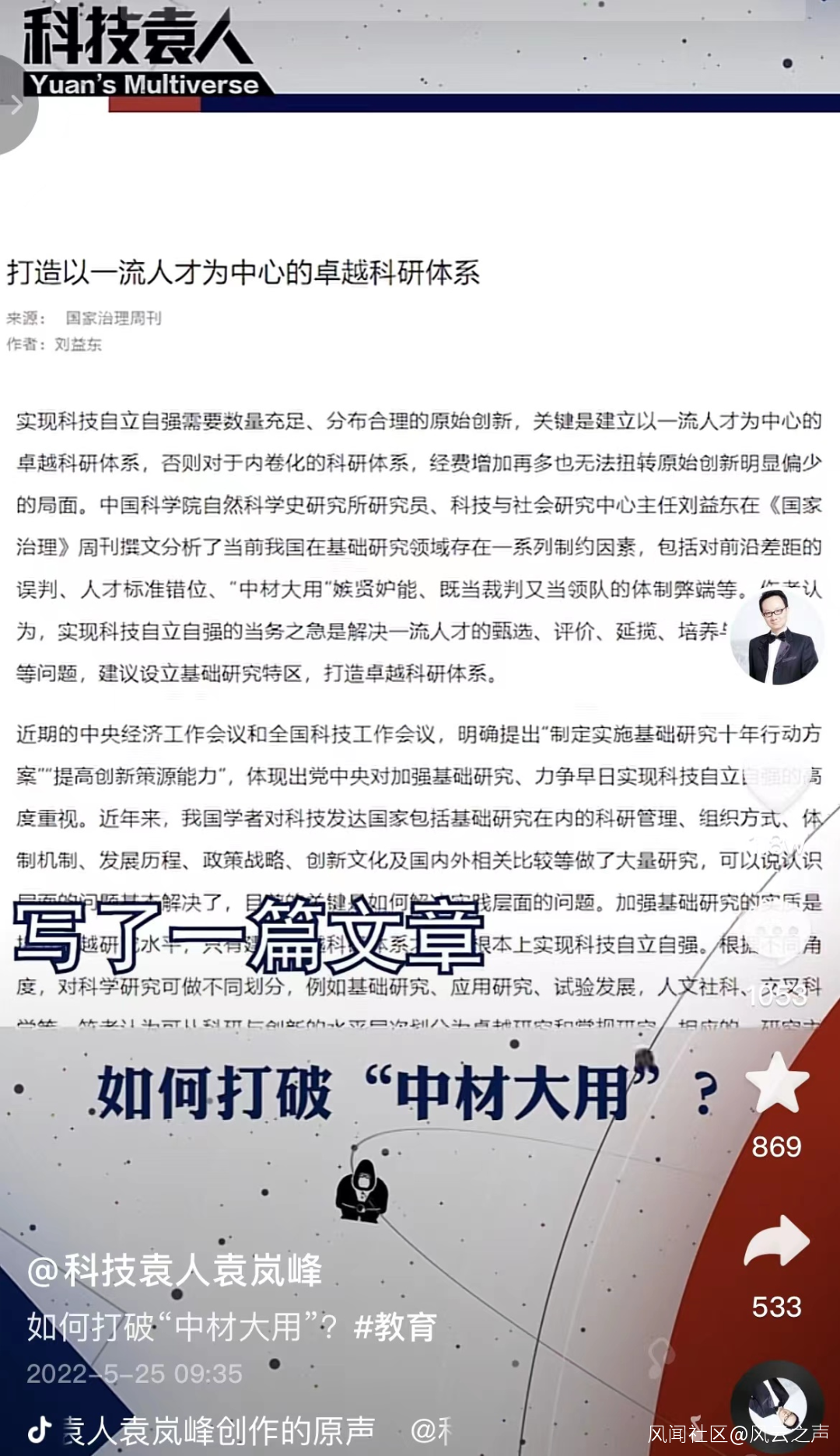 中國科學界目前最大的弊端是什麼?是用數論文、數帽子作為評價標準,導致“中材大用”。這種體系能產生大量的二流成果,卻難以產生一流成果,只適合跟隨,不適合趕超。最近,我的前輩朋友、中國科學院自然科學史研究所研究員、科技與社會研究中心主任劉益東老師在《國家治理》週刊寫了一篇文章《打造以一流人才為中心的卓越科研體系 | 劉益東》,闡述了這個問題。