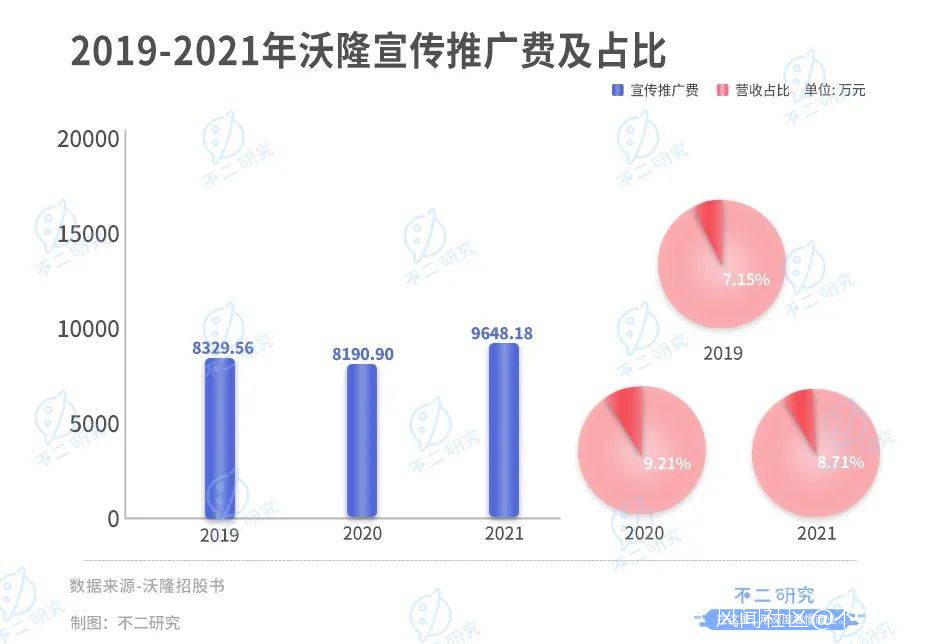 與眾多休閒食品企業一樣,沃隆在宣傳上不吝投入,通過打造品牌IP、明星合作、影視劇植入、頭部KOL帶貨等方式,提高品牌傳播聲量。招股書顯示,2019年-2021年,沃隆宣傳推廣費分別為8329.56萬元、8190.90萬元和9648.18萬元;佔總營業收入的比重分別為7.15%、9.21%和8.71%。但高額的宣傳推廣費對沃隆業績的助力似乎有限,2021年的營收規模仍未回到疫前水平。