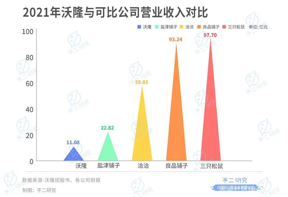 與其他休閒食品巨頭相比,沃隆的營收規模並不算大。年報顯示,2021年三隻松鼠、良品鋪子、洽洽和鹽津鋪子的營業收入分別為 97.70億、93.24億、59.85億和22.82億元。其中即使稍顯弱勢的鹽津鋪子,營收規模也兩倍於沃隆。