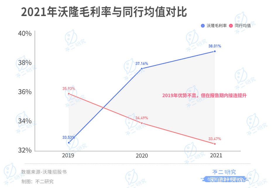 但在毛利率方面,沃隆卻領先大多數巨頭。招股書顯示,2019年-2021年,沃隆綜合毛利率分別為33.53%、37.16%和38.01%;可比公司毛利率平均水平分別為35.93%、34.49%和33.47%。沃隆的毛利率雖在2019年優勢不顯,但在報告期內接連提升。