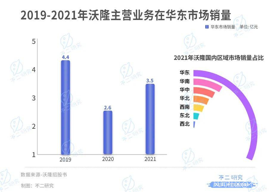 從區域銷售業績來看,沃隆還存在線下銷售區域過分集中的風險。招股書顯示,沃隆主營業務在華東市場的銷量為3.5億元,佔整體營收的31.72%。華南、華北、華中、西南、東北、西北等六個國內區域市場銷量均不到億元,並且呈現全線銷量下滑的態勢。