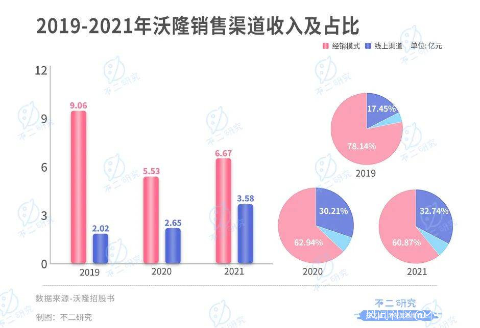 從渠道來看,沃隆以線下為主,其中線下經銷是最主要的銷售模式。招股書顯示,2019年-2021年經銷模式收入分別為9.06億、5.53億和6.67億元,佔主營業務收入的比重分別為 78.14%、62.94%及 60.87%。