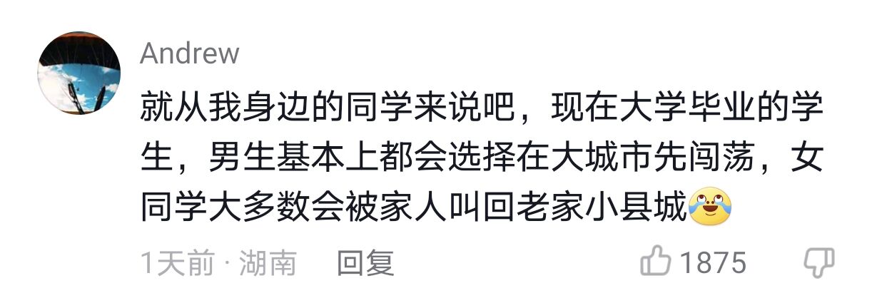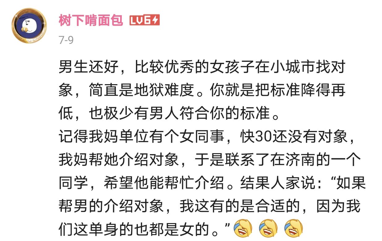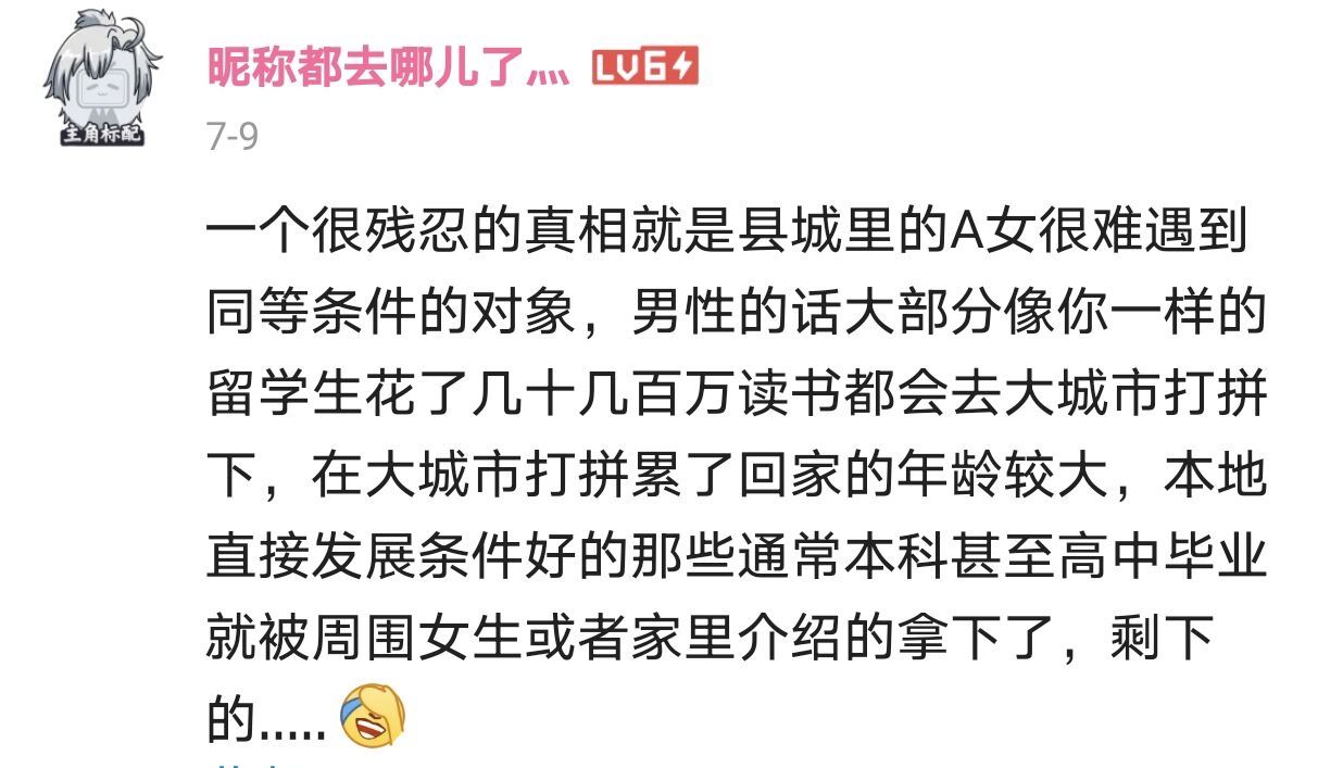 B站的用户應該是年輕人多一些吧,看他們評論説,優秀的女孩子在小城市找對象,簡直是地獄難度,得把標準一降再降。