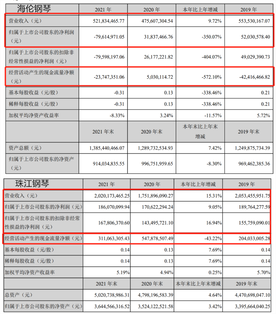 同時,兩家公司經營活動產生的現金流量淨額均同比減少。海倫鋼琴2021年經營活動產生現金淨流出2374.74萬元,較比2020年淨流入的503.01萬元減少了572.10%;珠江鋼琴經營活動產生的現金淨流入3.11億元,同比減少了43.22%。