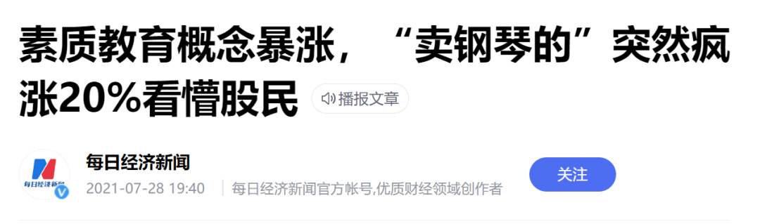 當時兩家公司股票紛紛大漲引發了媒體和投資者的廣泛關注,有媒體更是以“素質教育概念暴漲,‘賣鋼琴的’突然瘋漲20%看懵股民”為標題進行報道。
