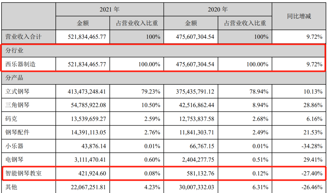 而在海倫鋼琴的財報中,幾乎看不到相關教育培訓類業務及產品的營收貢獻。分行業來看,西樂器製造行業收入2020、2021年度佔總營收比重均為100%。而分產品來看,與教育相關的智能鋼琴教室產品收入僅42.19萬元,同比下降了27.4%,佔總營收比重僅0.08%;2020年該項業務營收也僅58.11萬元,佔總營收比重僅0.12%。