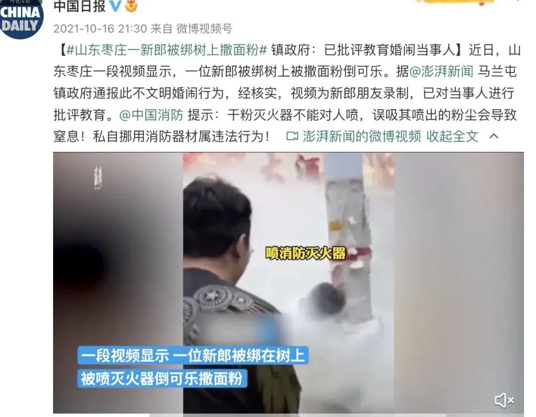 山東棗莊一位新郎被綁在樹上,撒麪粉倒可樂,噴消防滅火器…
