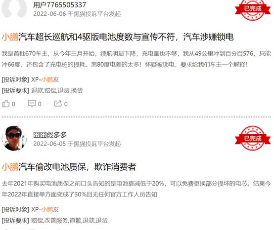 《港灣商業觀察》在黑貓投訴平台檢索小鵬汽車時發現,截止2022年7月6日,小鵬汽車在黑貓投訴上共有706條投訴,已回覆706條,已完成573條。