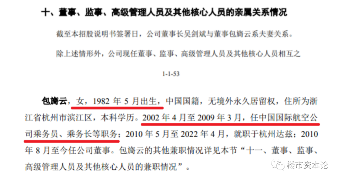 招股書顯示,其夫人包旖雲1982年生人,比吳小13歲,22歲到27歲,曾經是國航的空中小姐,還一直做到了乘務長的職位。從28歲開始,一夜之間鯉魚躍龍門,從空姐成為艾芬達董事。