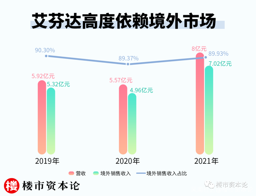 招股書顯示,2019-2021年,艾芬達分別實現營收5.92億元、5.57億元、8億元,其中來自境外銷售收入金額佔比分別達到90.30%、89.37%和89.93%,主要銷往歐洲、北美等。
