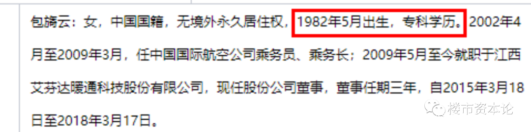 招股書顯示,其夫人包旖雲1982年生人,比吳小13歲,22歲到27歲,曾經是國航的空中小姐,還一直做到了乘務長的職位。從28歲開始,一夜之間鯉魚躍龍門,從空姐成為艾芬達董事。