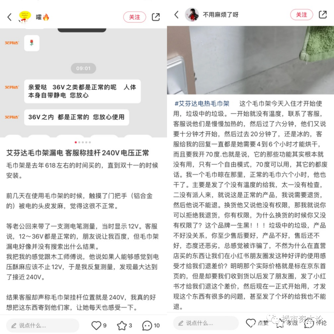 還有多位消費者表示,艾芬達電熱毛巾架在三年使用中壞了10次,過了保修期後維修費更是天價。