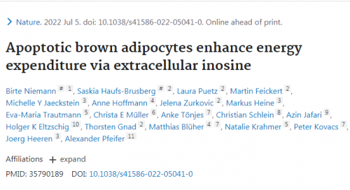 Niemann, B., Haufs-Brusberg, S., Puetz, L. et al. Apoptotic brown adipocytes enhance energy expenditure via extracellular inosine. Nature (2022). doi:10.1038/s41586-022-05041-0來源於公眾號:生物谷