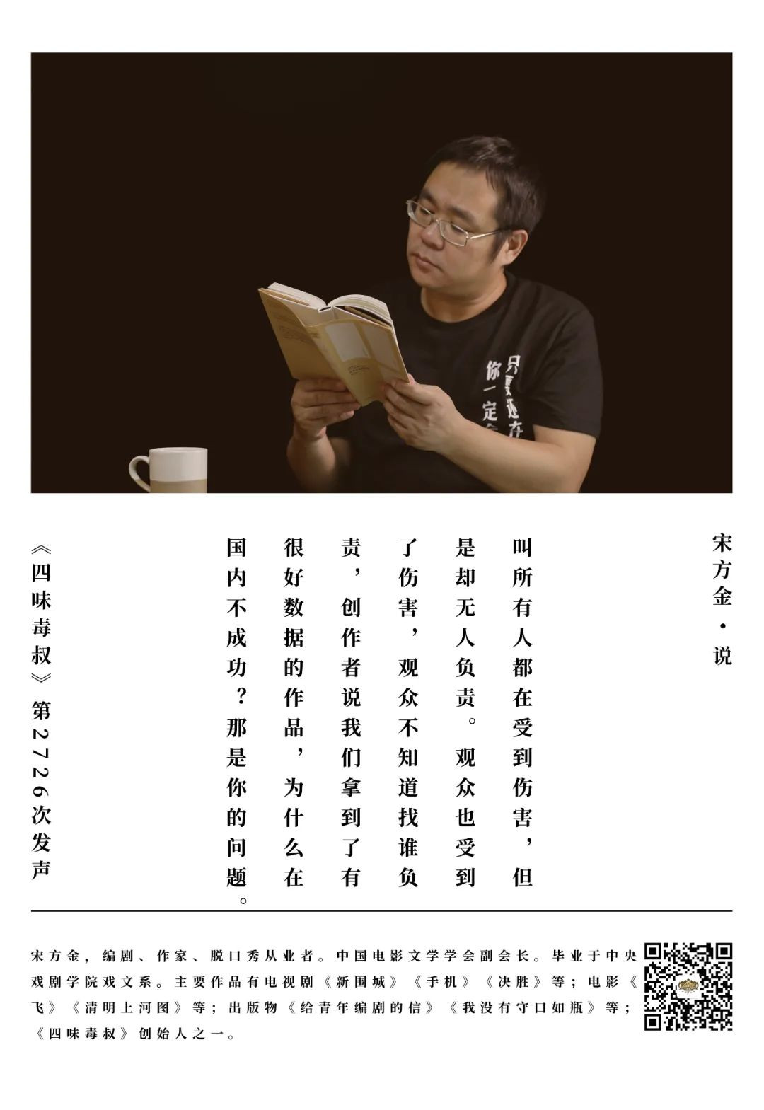 **宋方金:**對,所以我還有一句話,也是一句名言,叫所有人都在受到傷害,但是卻無人負責。什麼意思?觀眾也受到了傷害,觀眾不知道找誰負責。創作者説你看我們拿到了很好的數據的作品,找到了很成功的作品,那人家在韓國成功了,為什麼你在國內不成功?那是你的問題。