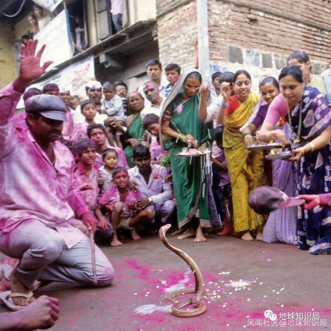 男人們放出裝在罐子裏的蛇,千百條蛇彎曲纏繞在濕婆像前,口吐信子,蛇身微微反射出柔軟的晨光。婦女們則用牛奶鮮花等供奉這些聖物。等一天的慶祝活動結束,這些蛇才會被重新放歸自然。