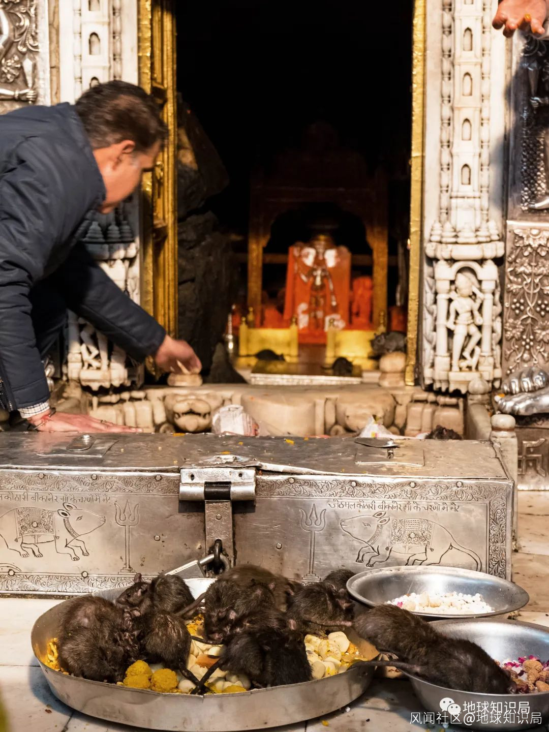 鼠廟裏滿地碩鼠,因為每天被悉心投餵,所以數以萬計的老鼠吃喝不愁;來廟裏朝聖的人則絡繹不絕,上至前土邦王,下到普通百姓,無不虔誠朝拜。人們認為這些老鼠會給自己帶來吉祥,因此數百年來鼠廟的香火綿延不絕。