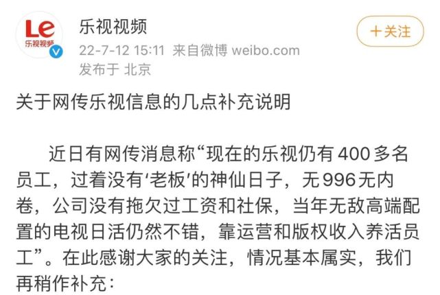 7月12日,一則“樂視員工沒有996和內卷”的消息在社交平台發酵,迅速衝上微博熱搜。