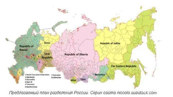根據美國substack 網站上的截圖,他們已經把俄羅斯劃分成了8塊飛地,多個共和國。值得一提的是,美國人細心得將克里米亞排除在了俄羅斯之外,最直接劃分給了烏克蘭。