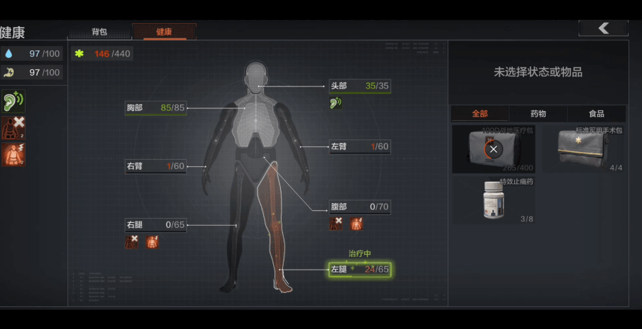 與此同時,玩家角色的身體狀態也被切分成多個模塊,不同部位的血量單獨計算而又相互關聯,影響遊戲對玩家的反饋:手臂受傷時,持槍會搖晃,也更難瞄準;腿腳受傷時,移動速度變慢,甚至寸步難行;胸腹受傷則更容易失血死亡。為了確保生存,玩家需要使用藥品、繃帶、手術等方式治癒自己,同時以食物和水補充生命力與體力。