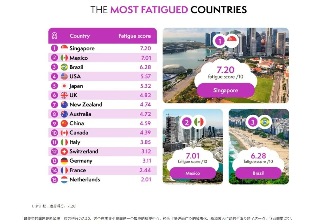 2020年,在英國的一份世界國家的工作時間調查中,新加坡人的勞動時間位列墨西哥之後,為2238小時;而在同期的疲勞度調查中,新加坡人的疲勞得分則最高,為7.2。