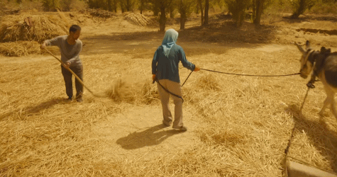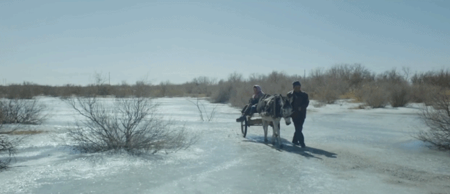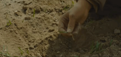片中有個場景,有鐵拉着驢犁地,貴英坐在犁耙上,犁過的地方成一道道翻新的深色土壤,就像被水剛淋濕過。
