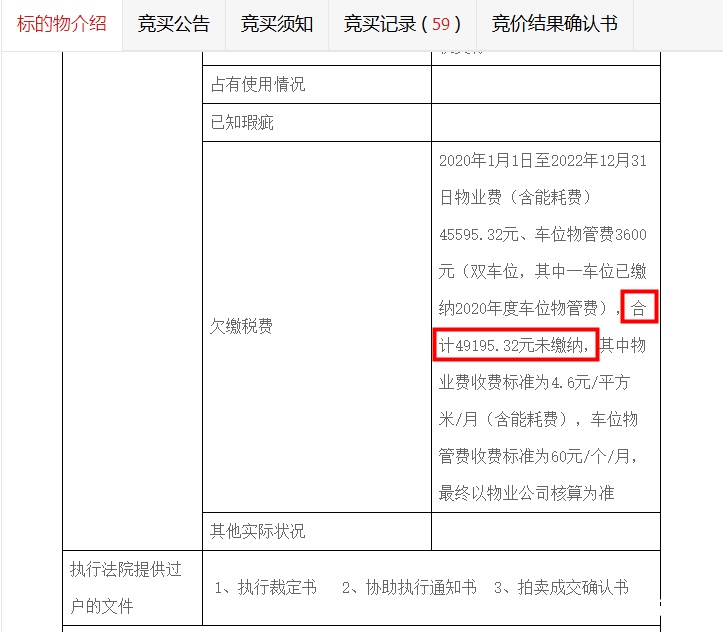 同時房屋欠費問題也是不容忽視的一點,像上述房源,在拍賣平台上都有註明,物業欠費都是萬元為單位進行計算。