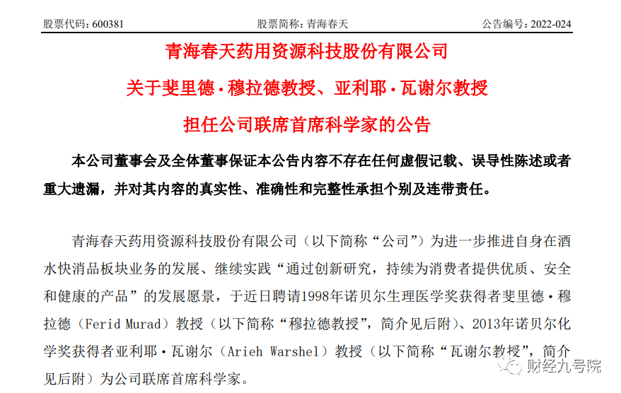 7月14日,青海春天發佈公告稱,為進一步推進自身在酒水快消品板塊業務的發展、繼續實踐“通過創新研究,持續為消費者提供優質、安全和健康的產品”的發展願景,公司於近日聘請1998年諾貝爾生理醫學獎獲得者斐裏德·穆拉德(Ferid Murad)教授(下稱“穆拉德”)、2013年諾貝爾化學獎獲得者亞利耶·瓦謝爾(Arieh Warshel)教授(下稱“瓦謝爾”)為公司聯席首席科學家。