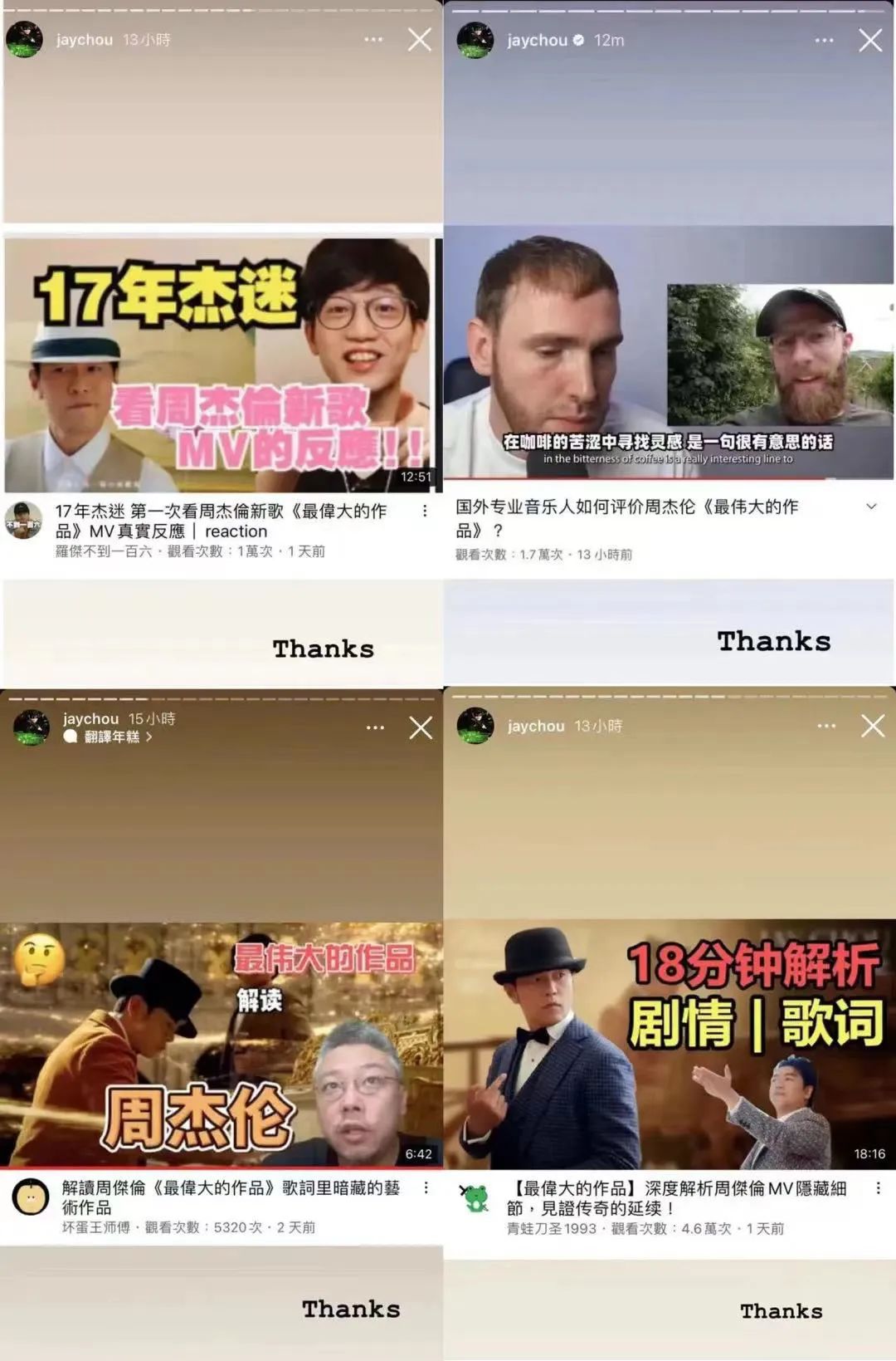其中,B站UP主們的二創視頻存在感最強,頻繁出現在朋友圈、短視頻和各路熱點裏。硬糖君就是在#最偉大的作品解讀#微博熱搜裏,看完UP主@不是柯桑德的視頻,成功直達B站卷瘋了的二創戰場,補完各種版本的《最偉大的作品》。(一個熱知識,周董也點讚了這個二創作品!)