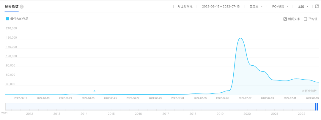 綜合各種指數來看,《最偉大的作品》在發出的第三天前後搜索和瀏覽的峯值。這正與粉絲髮布二創最活躍的時間段重合。