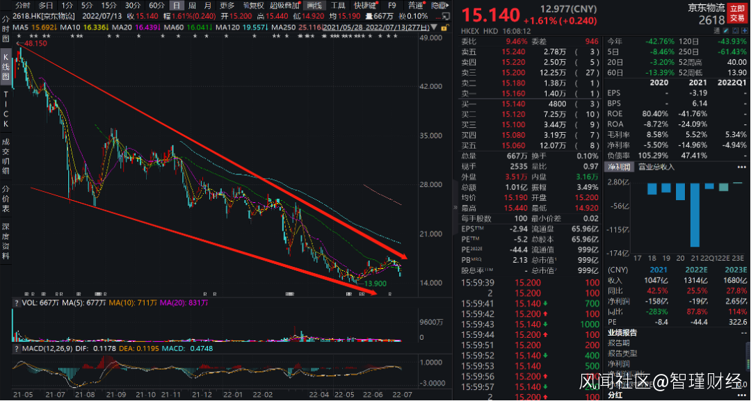 作為中國供應鏈物流龍頭,但京東物流(HK:02618)給人一種上市即巔峯的感覺,股價從剛開盤幾天最高的48港元/股開始,基本處於持續下跌的狀態,截至7月13日收盤15.14港元/股,跌幅近70%,要想重返昔日高光時刻,恐怕遙遙無期,目前市值跌破1000億港元大關。