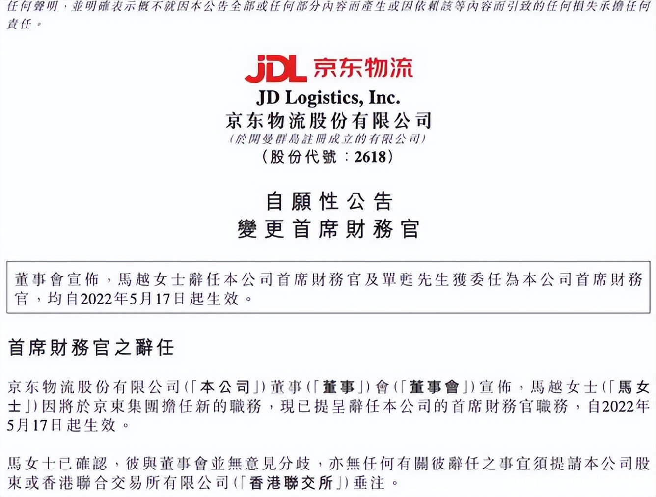前不久的2022年5月17日,京東物流發佈公告稱,原CFO馬越因將於京東集團擔任新的職務,現已提呈辭職,自2022年5月17日起生效。同時,單蘇已獲接任京東物流新CFO。