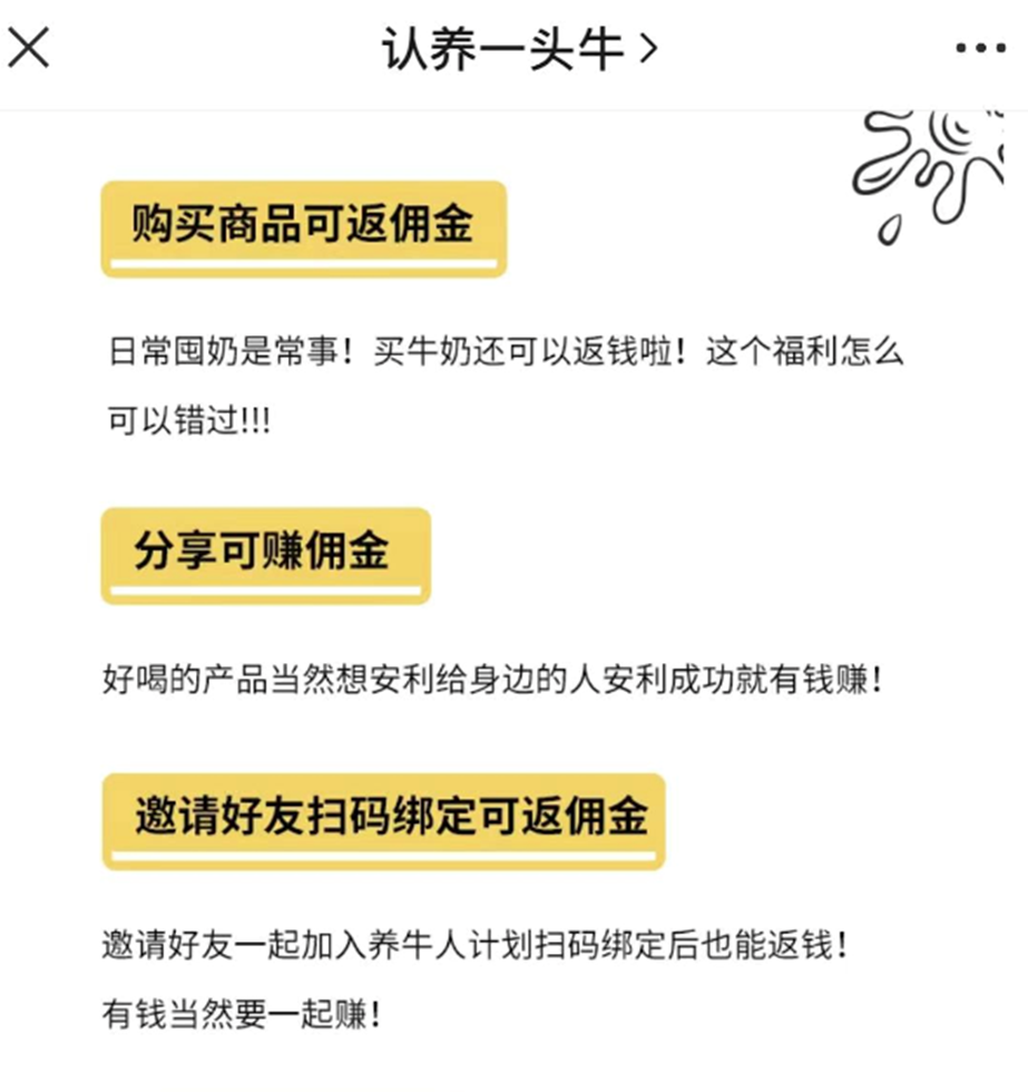 2020年,認養一頭牛推出的“養牛人招募計劃”,具體包括“購買商品可返佣金”、“分享可賺佣金”、“邀請好友掃碼綁定可返佣金”等活動。
