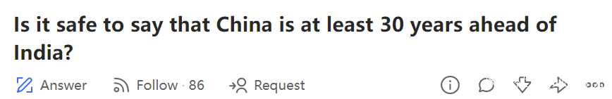 在外網有一個話題:**可以肯定地説,中國至少領先印度30年嗎?**一些國外網民發表了自己的看法。