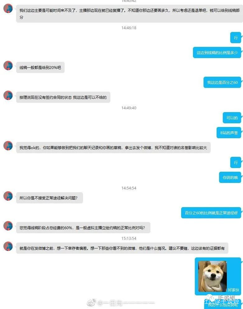 根據聊天記錄,這件事也並不複雜。畫師為B站電競繪製live2D皮套,因為突發情況,B站決定撤稿了,而由於畫師已經着手繪製了,B站表示稿費可以給到線稿的部分。