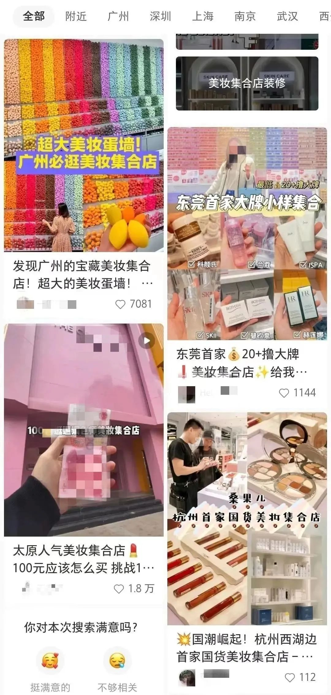 在小紅書上搜索“美妝集合店”,相關筆記超2萬篇。“小樣天堂”、“學生黨必逛”、“美妝蛋牆”、“口紅牆拍照”等均成為不同美妝博主筆記中的高頻詞。