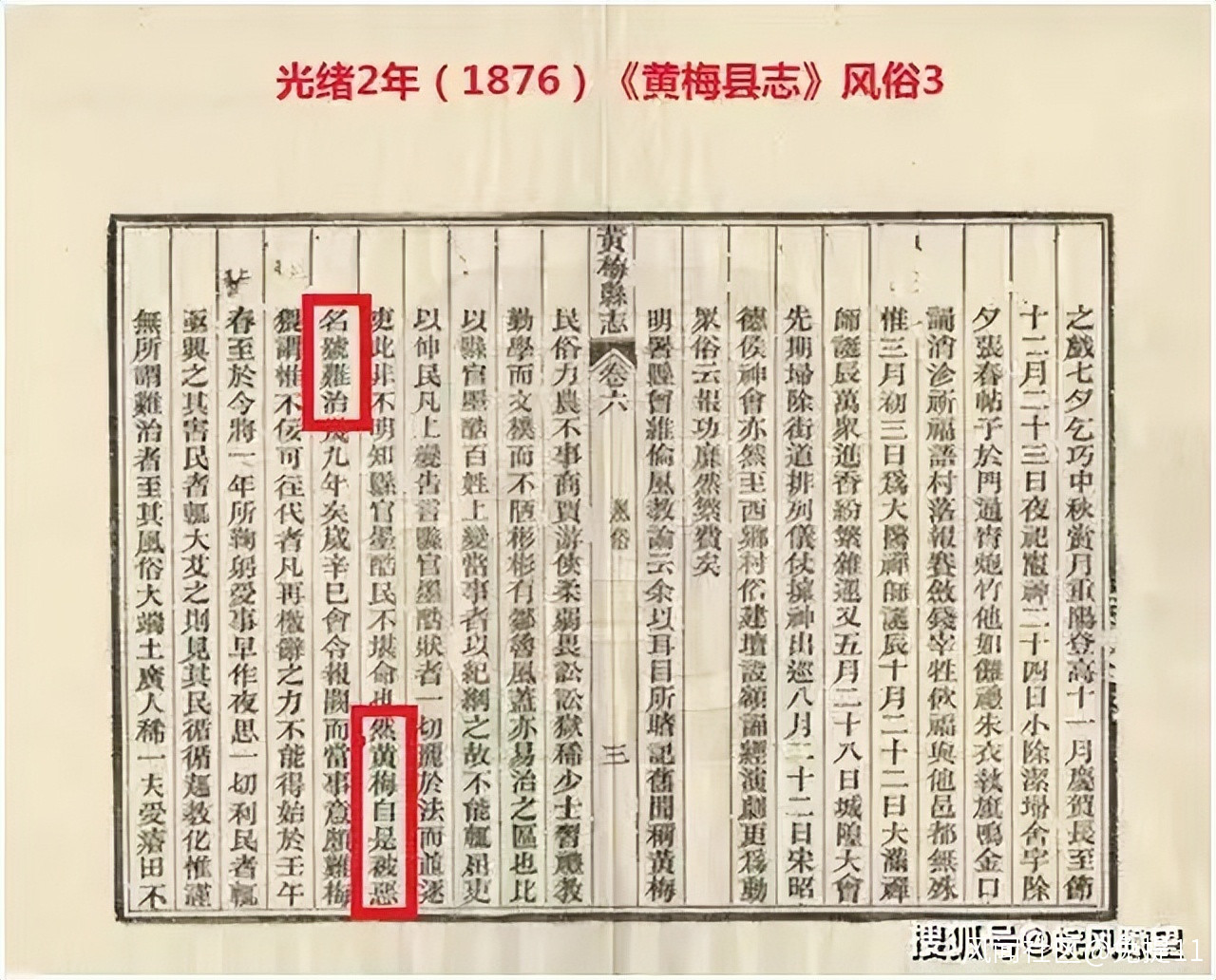 原文是“然黃梅自是後被惡名號難治幾九年矣”。安徽人在利用這句話時,省略了“被”這個關鍵字,同時利用省略的“被”字和後面的“號”字,將“惡名”與“難治”拼接起來,組成了目前被他們廣泛傳播的“惡名難治”。