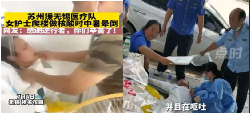 7月14日,江西南昌縣當天温度高達38℃,核酸採樣現場一名護士突然暈倒,經搶救半小時後才脱離危險。