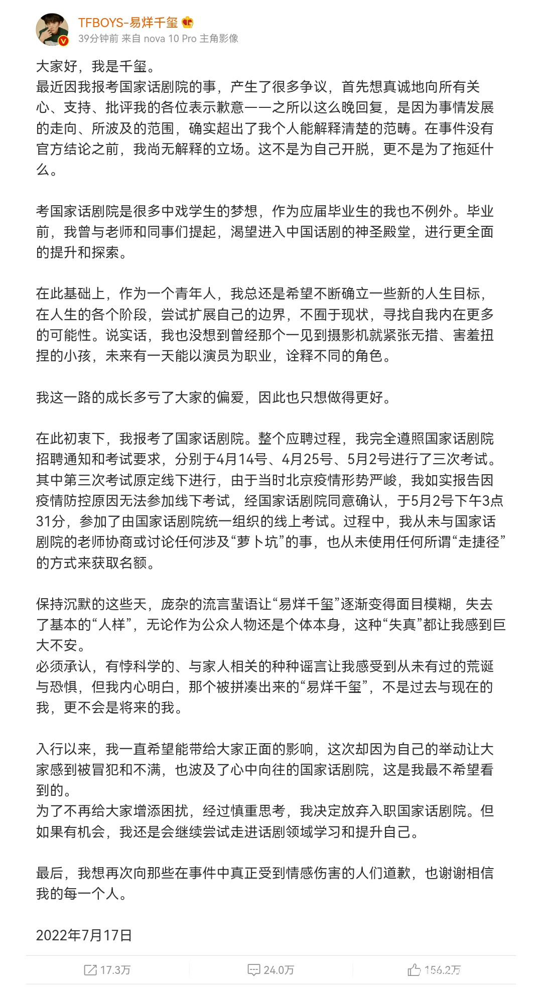 青年演員易烊千璽今天發佈消息:主動放棄入職國家話劇院。讓一個由飯圈引起的沸沸揚揚了十幾天的無厘頭鬧劇暫時劃上逗點。